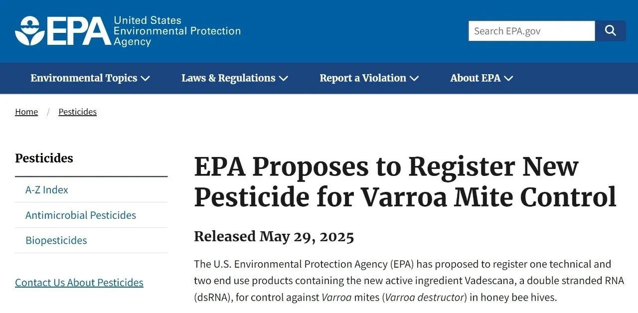美国环境保护署(US EPA)宣布,拟批准GreenLight Biosciences公司的又一款基于RNAi的新型生物农药—Vadescana,用于控制蜜蜂巢穴中的瓦螨(Varroa destructor)